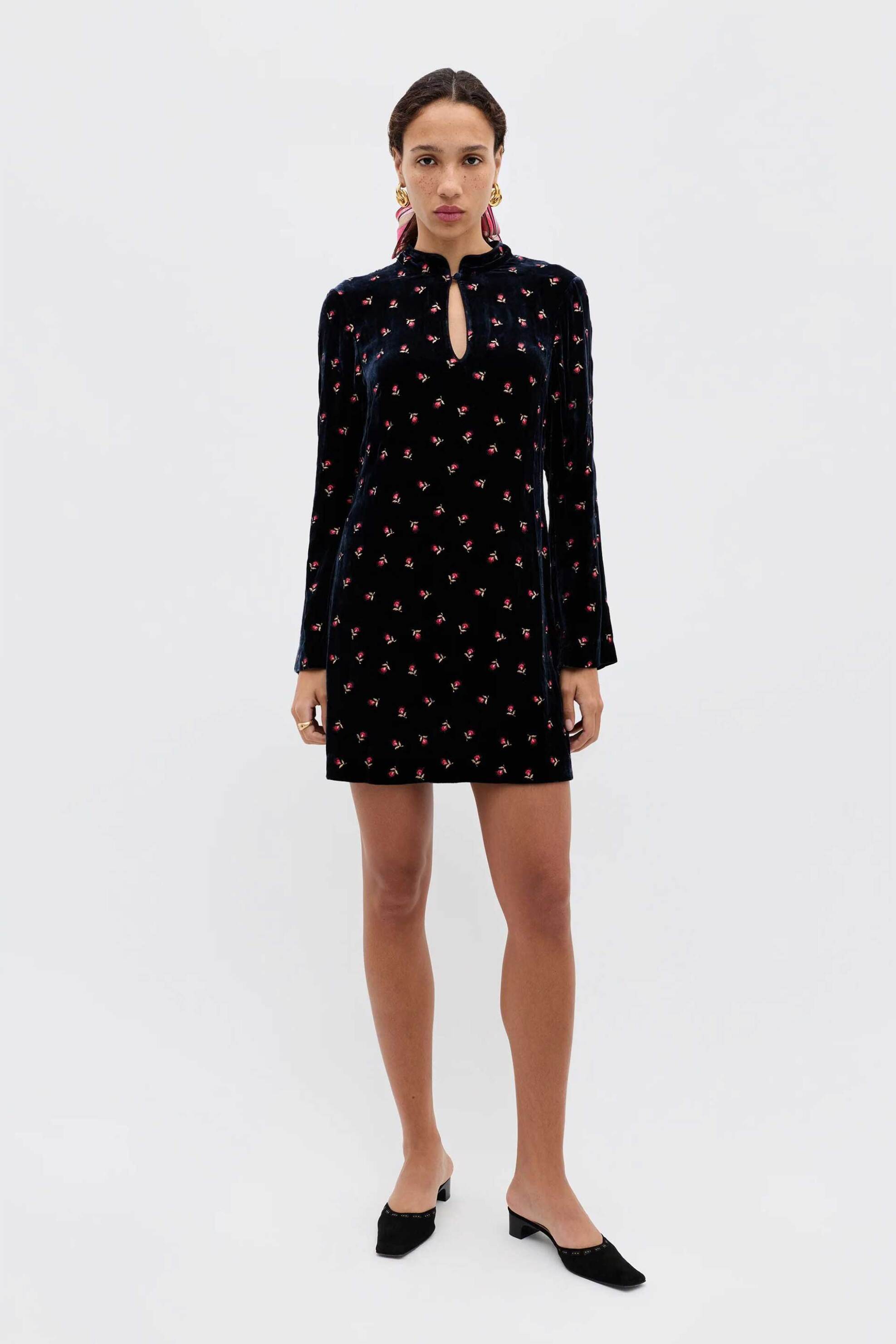Γυναικείο mini φόρεμα. Velvet. All-over print. Kλειστή λαιμόκοψη. Mακρύ μανίκι. Προέλευση: RO. 81% βισκόζη, 19% μετάξι RIXO LTD