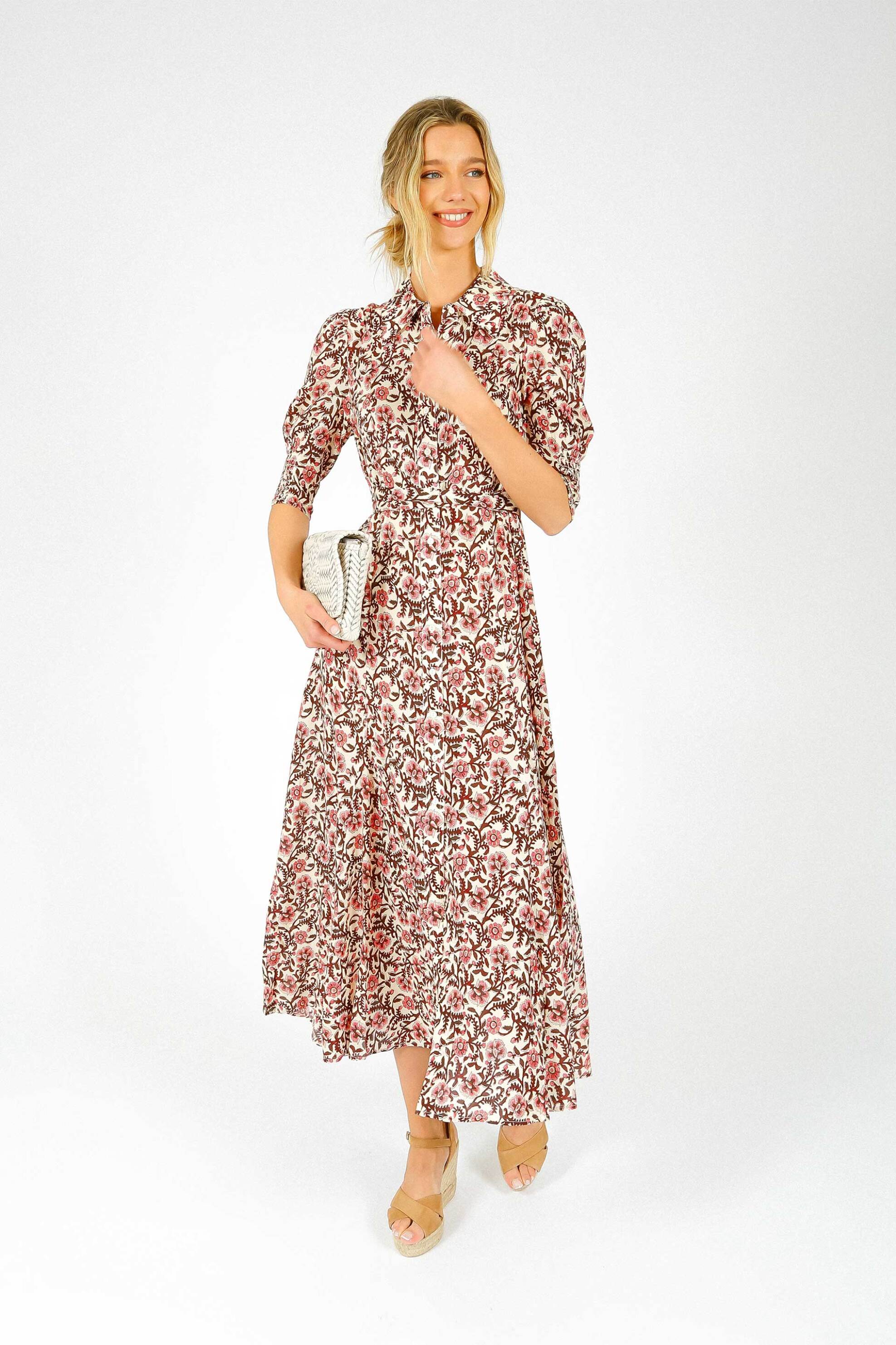 Γυναικείο σεμιζίε midi φόρεμα. Floral print. Γιακάς. Κλείσιμο με κουμπια. Μανίκι 3/4. Ζώνη στη μέση. 100% βισκόζη