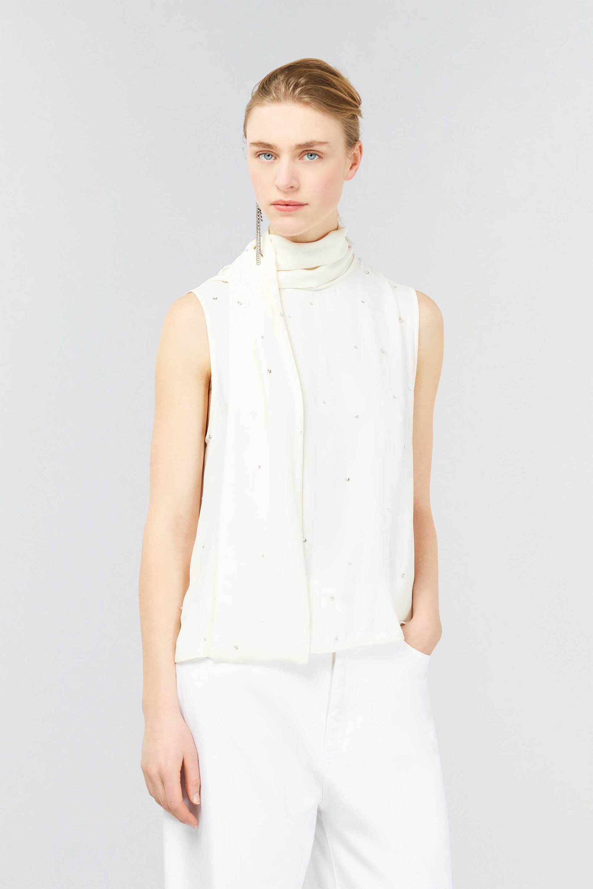 Γυναικεία μπλούζα. Αμάνικη. Κλειστή λαιμόκοψη με λεπτομέρεια γραβάτα. Κεντημένη με πέτρες Swarovski. Regular fit. 100% βισκόζη Το μοντέλο έχει ύψος 174 cm και φοράει 42/M (Italian size).
