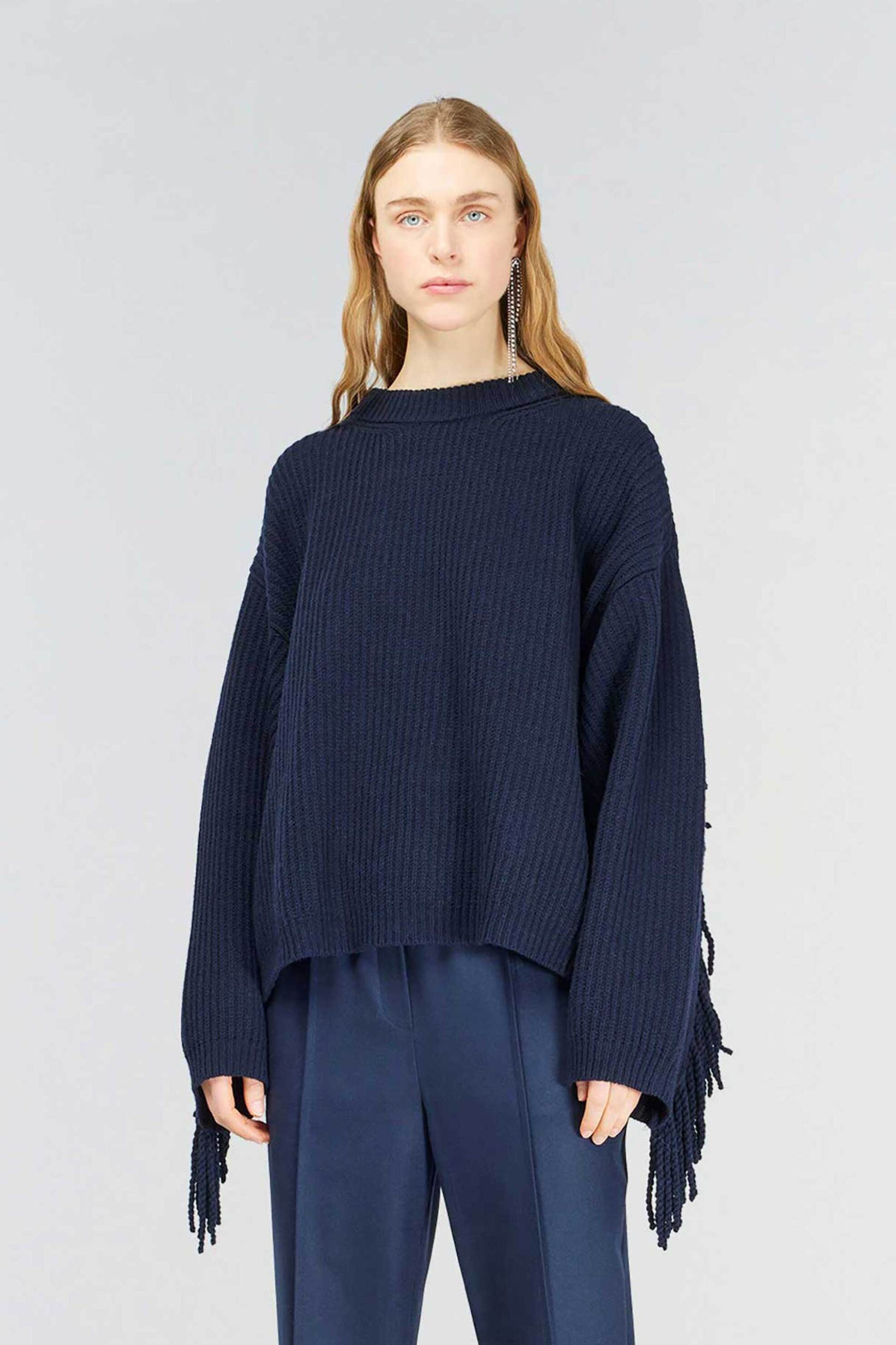 Γυναικείο πουλόβερ. Στρογγυλή λαιμόκοψη. Μακρύ μανίκι. Σχέδιο ribbed. Διακοσμητικά κρόσσια στην πλάτη. Regular fit. 80% μαλλί, 20% polyamide Το μοντέλο έχει ύψος 177 cm και φοράει 42/M (Italian size).