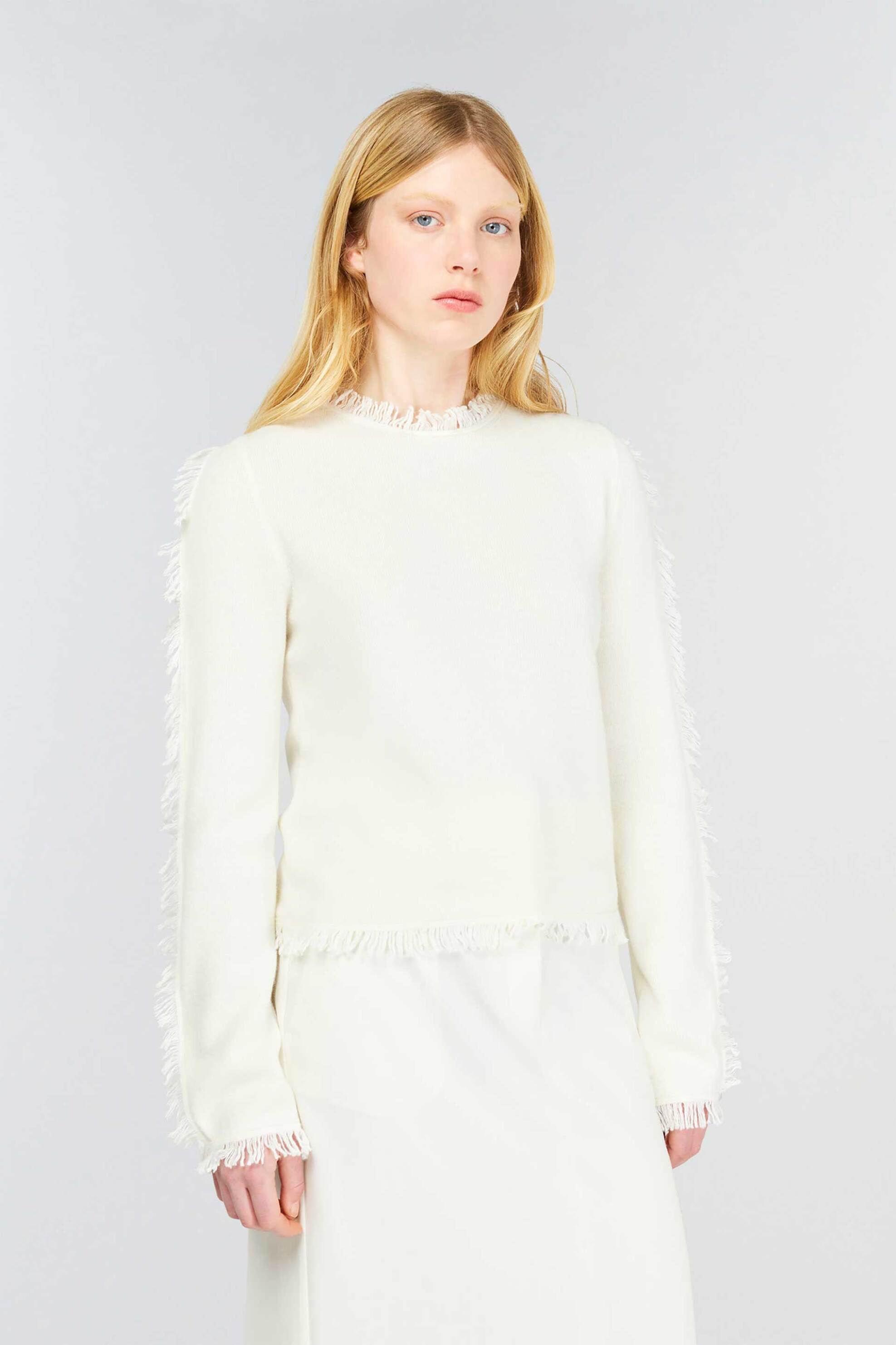 Γυναικείο πουλόβερ. Στρογγυλή λαιμόκοψη. Μακρύ μανίκι. Διακοσμητικά ξέφτια. Tight fit. 35% polyamide, 30% μαλλί, 30% βισκόζη, 5% κασμίρι