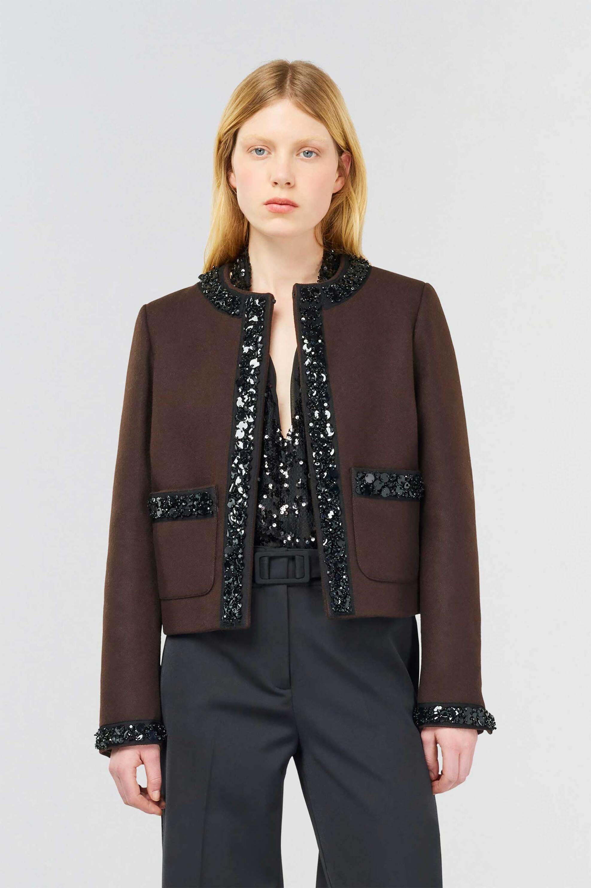 Γυναικείο σακάκι. Διακοσμητική παγιέτα. Στρογγυλή λαιμόκοψη. Κλείσιμο με κόπιστες. Μακρύ μανίκι. Τσέπες. Regular fit. 80% fleece μαλλί, 20% polyamide Το μοντέλο έχει ύψος 174 cm και φοράει 42/M (Italian size).
