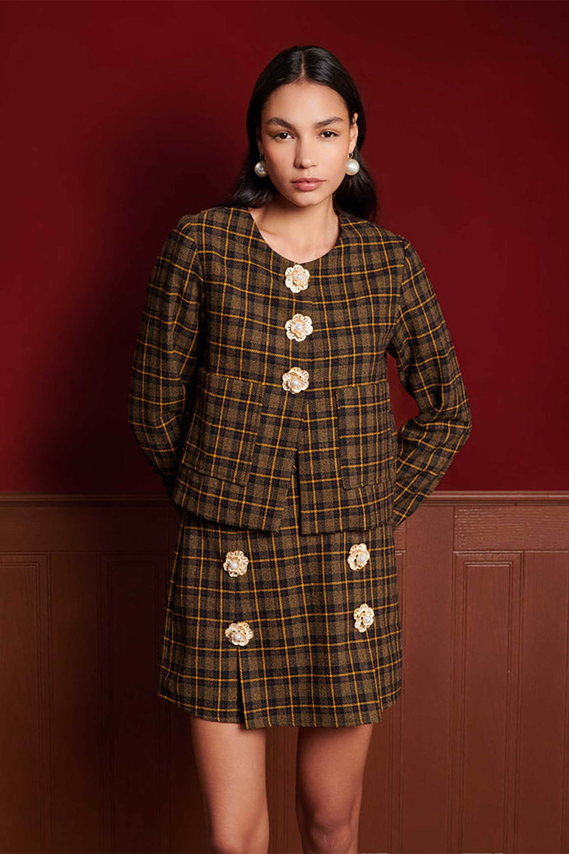 Γυναικείο τζάκετ καρό. Στρογγυλή λαιμόκοψη. Μακρύ μανίκι. Κλείσιμο με κουμπιά σε σχήμα λουλούδι. 50% μαλλί, 50% polyester Το μοντέλο έχει ύψος 5'8' και φοράει νούμερο S (UK 8).