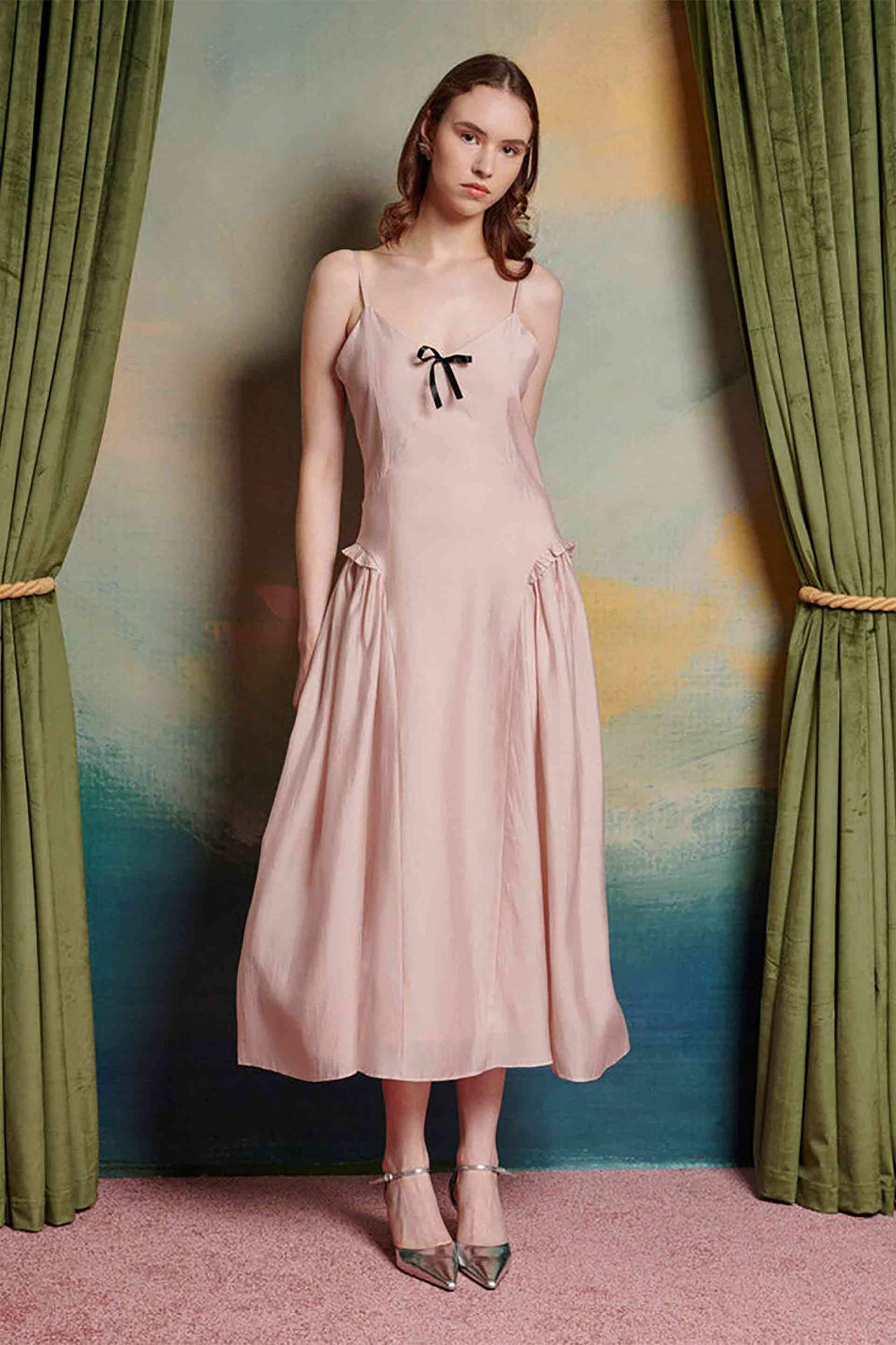 Γυναικείο midi φόρεμα. Λεπτά τιραντάκια. Διακοσμητικό κορδελάκι. Κλείσιμο με φερμουάρ στην πλάτη. Διακοσμητικό βολάν στο πλάι. 60% lyocell, 40% polyester