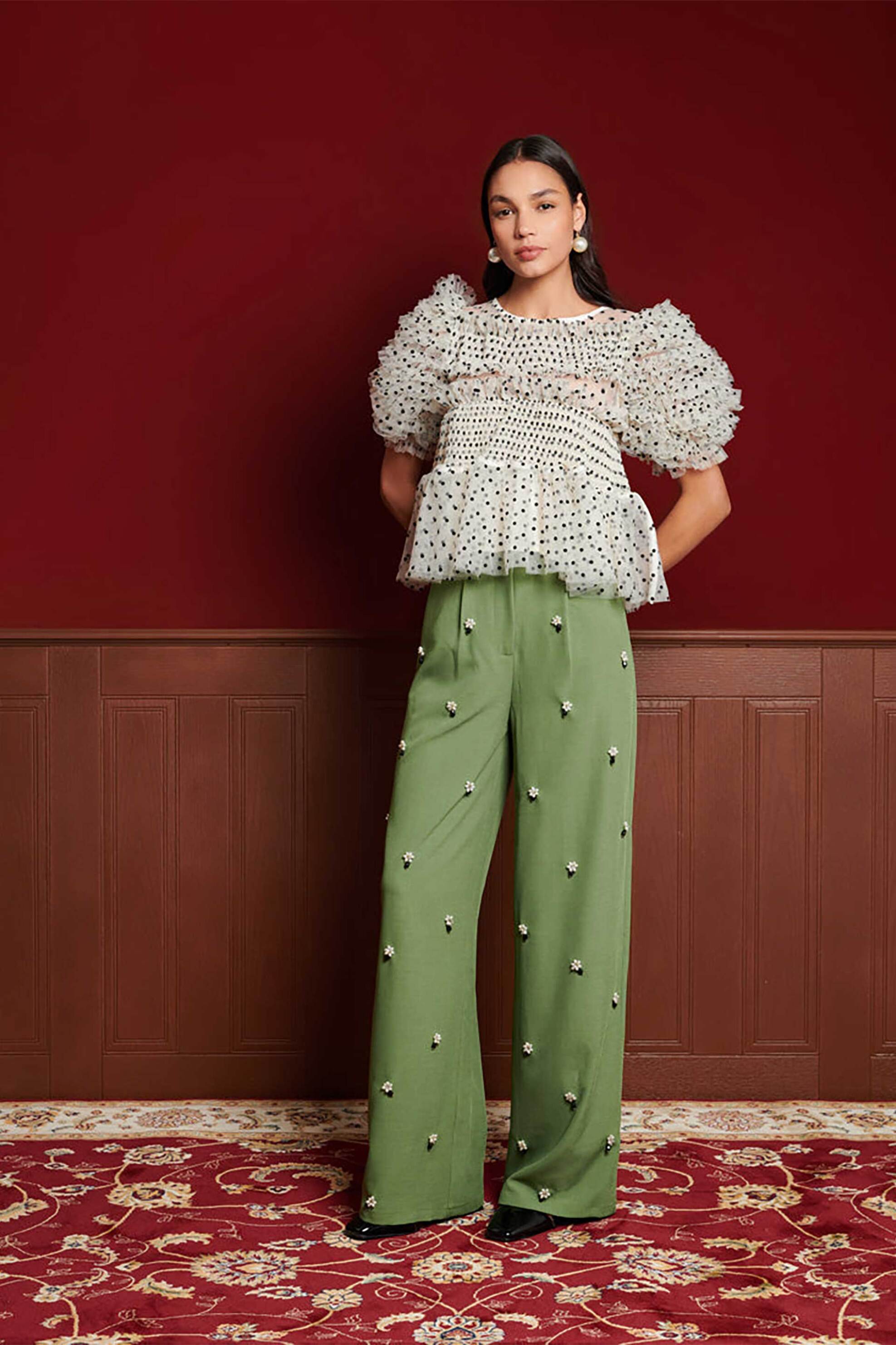 Γυναικείο παντελόνι. Ψηλόμεσο. Κέντημα με περλές. Τσέπες στο πλάι. Κλείσιμο με φερμουάρ και κουμπί. 96% polyester, 4% elastane Το μοντέλο έχει ύψος 5'8' και φοράει νούμερο S (UK 8).