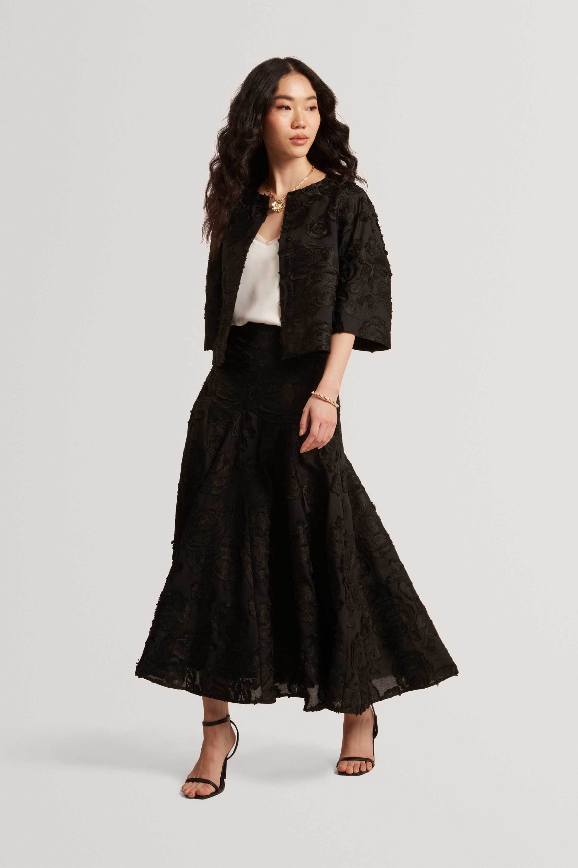 Γυναικεία φούστα maxi. Ψηλόμεση. Flare κάτω μέρος. A-line. Ανάγλυφα λουλούδια. Προέλευση: Κίνα. 100% polyester Το μοντέλο έχει ύψος 177 cm και φοράει νούμερο 36. SPORT & FASHION FREEDOM A.E.