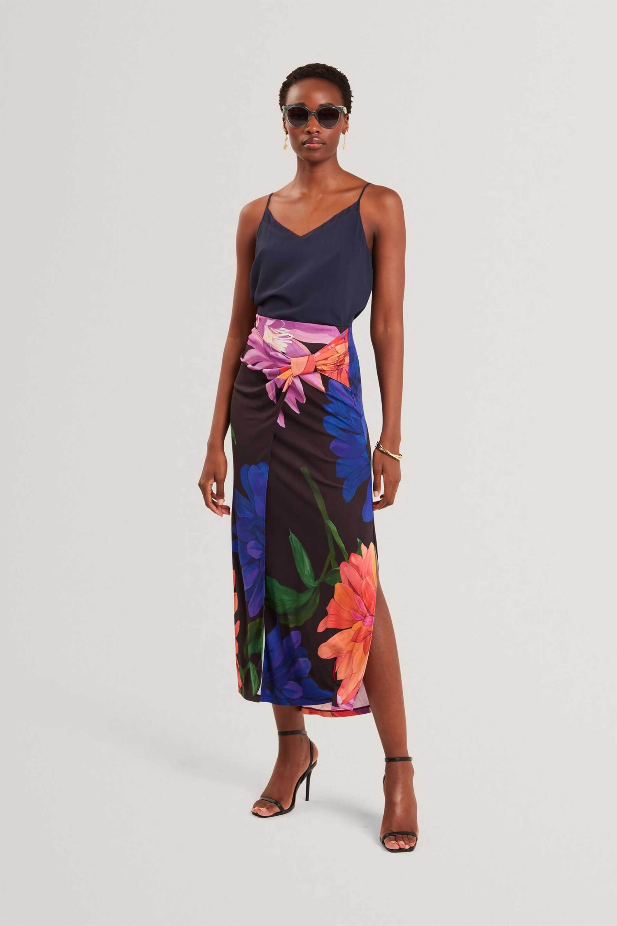 Γυναικεία midi φούστα. Ψηλόμεση. Άνοιγμα στο πλάι. Floral print. Σχέδιο με κόμπο μπροστά. Κλείσιμο με φερμουάρ. Προέλευση: Κίνα. 100% βισκόζη Το μοντέλο έχει ύψος 179 cm και φοράει νούμερο 36. SPORT & FASHION FREEDOM A.E.