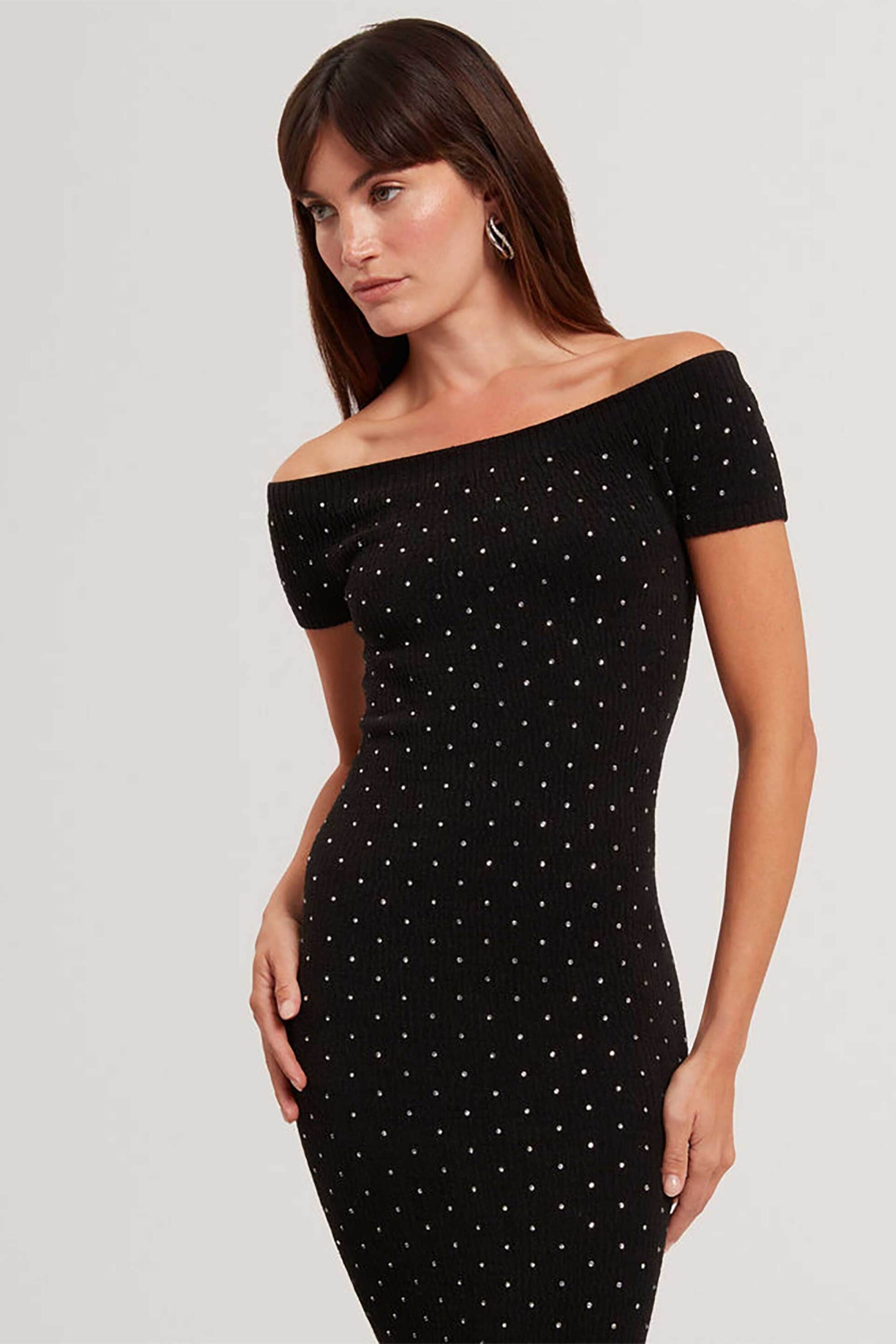 Γυναικείο midi φόρεμα. Carmen λαιμόκοψη. Κοντό μανίκι. Slim fit. Μονόχρωμο. All-over τρούκς. Προέλευση: Τουρκία 88% polyester, 8% latex, 3% polyamide, 1% βαμβάκι SPORT & FASHION FREEDOM A.E.