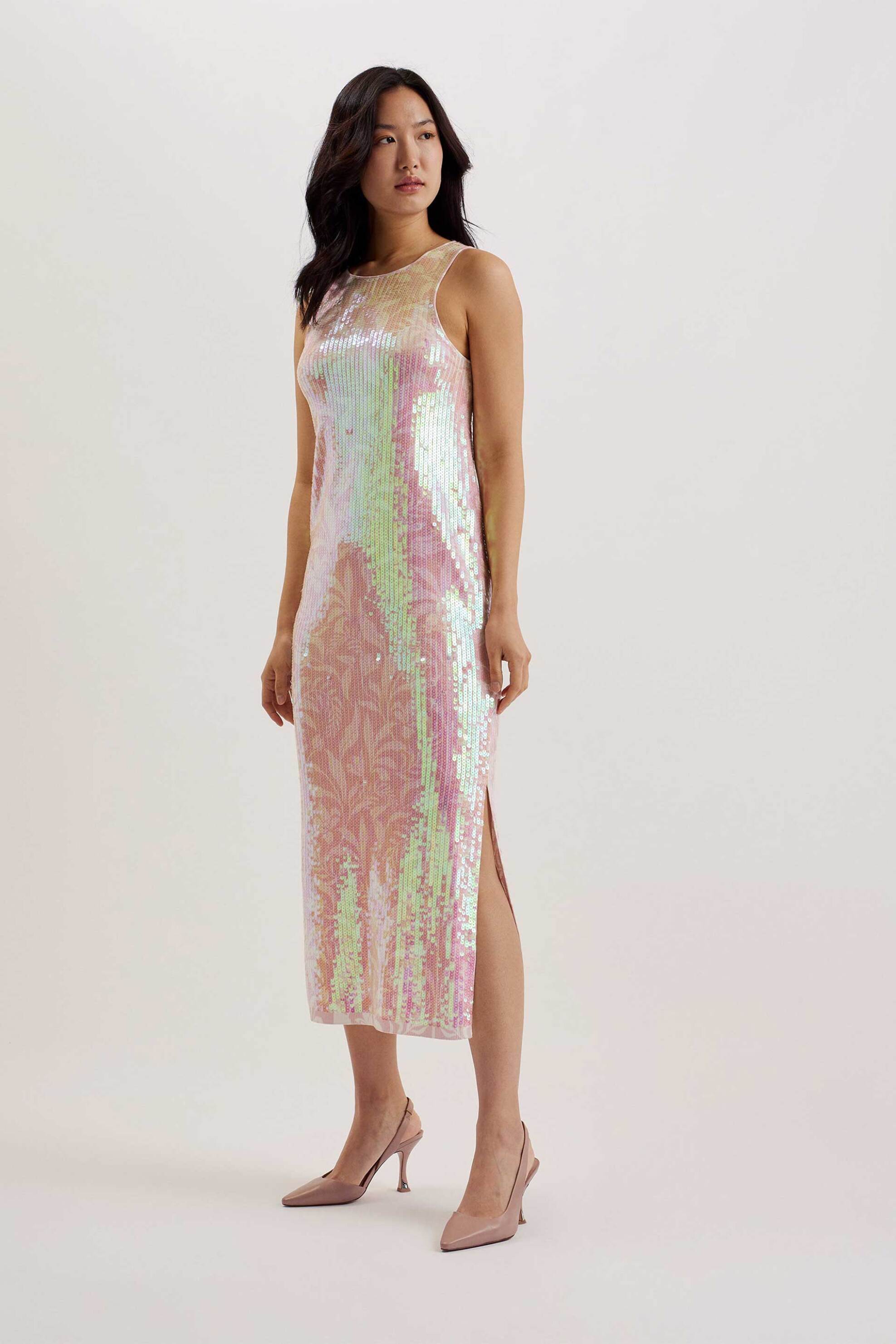 Γυναικείο midi φόρεμα. Παγιέτες. Αμάνικο. Στρογγυλή λαιμόκοψη. Άνοιγμα στο πλάι. 80% βισκόζη, 20% polyamide