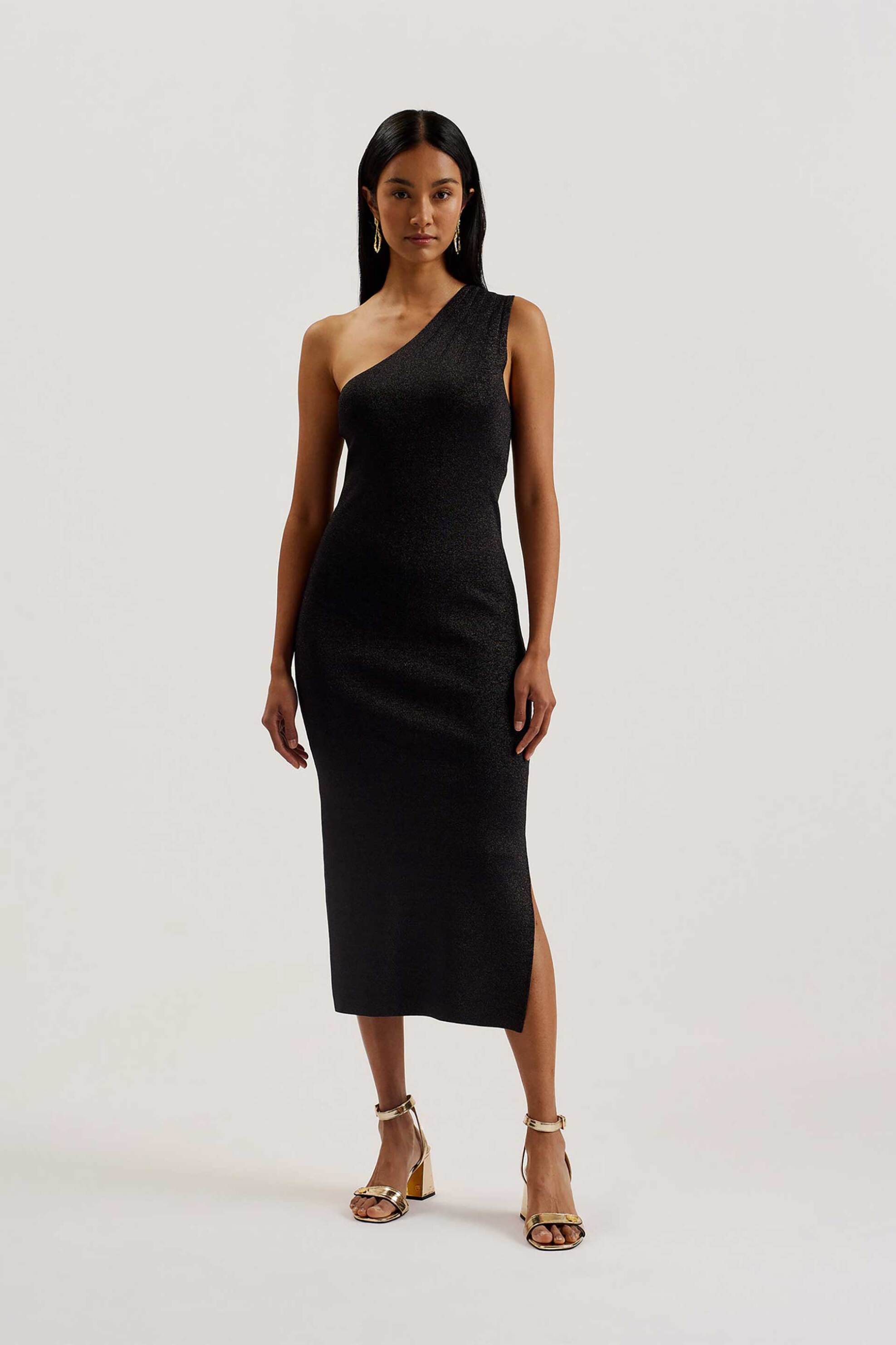 Γυναικείο midi φόρεμα. Ένας ώμος. Μακρύ μανίκι balloon. Στενή γραμμή. Άνοιγμα στο κάτω μέρος. 60% nylon, 40% metallic lurex