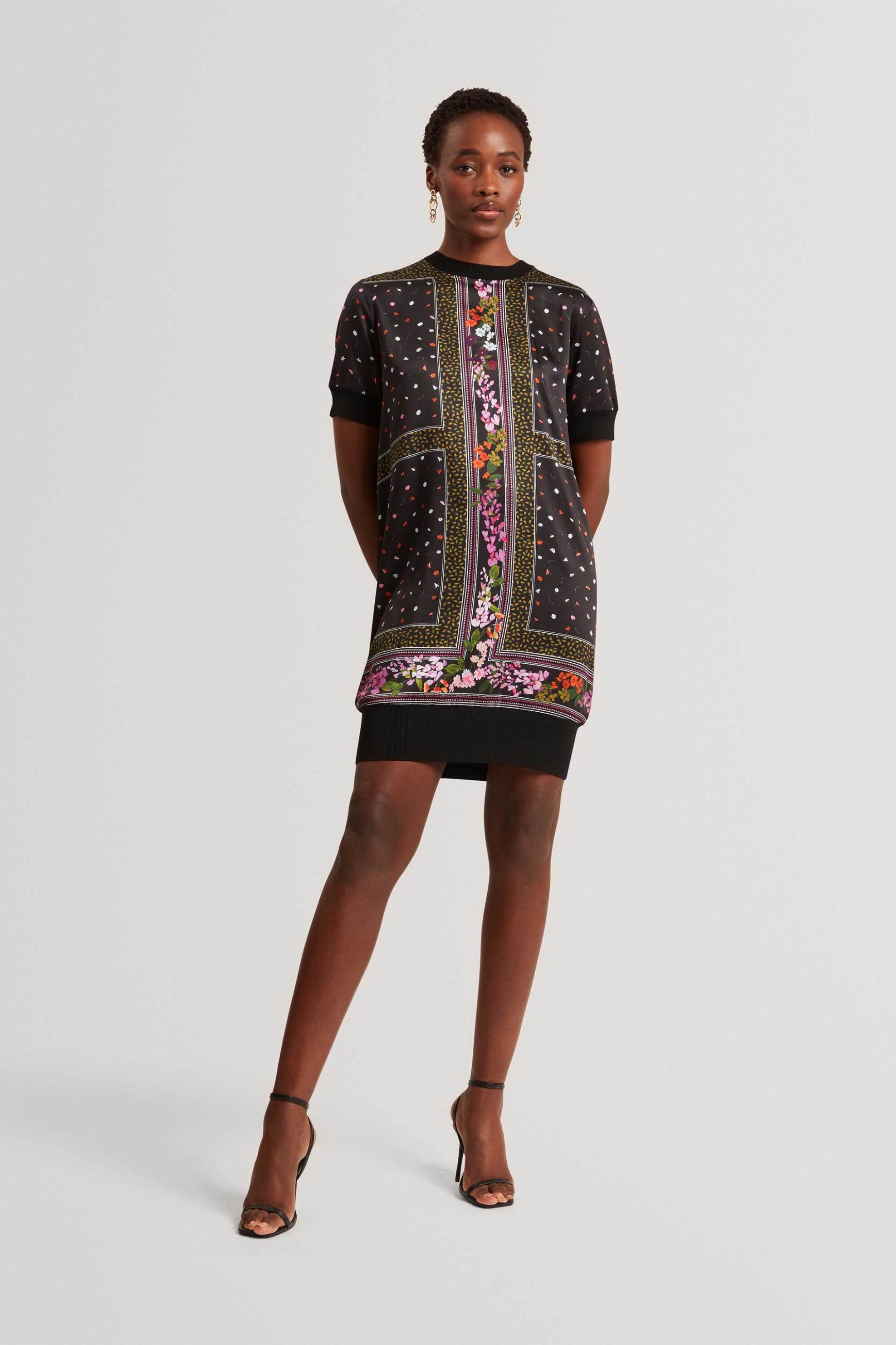 Γυναικείο mini φόρεμα. Κλειστή λαιμόκοψη. Κοντό μανίκι. Scarf print. Μονόχρωμο στο πίσω μέρος. Προέλευση: Κίνα. 100% bright rayon SPORT & FASHION FREEDOM A.E.