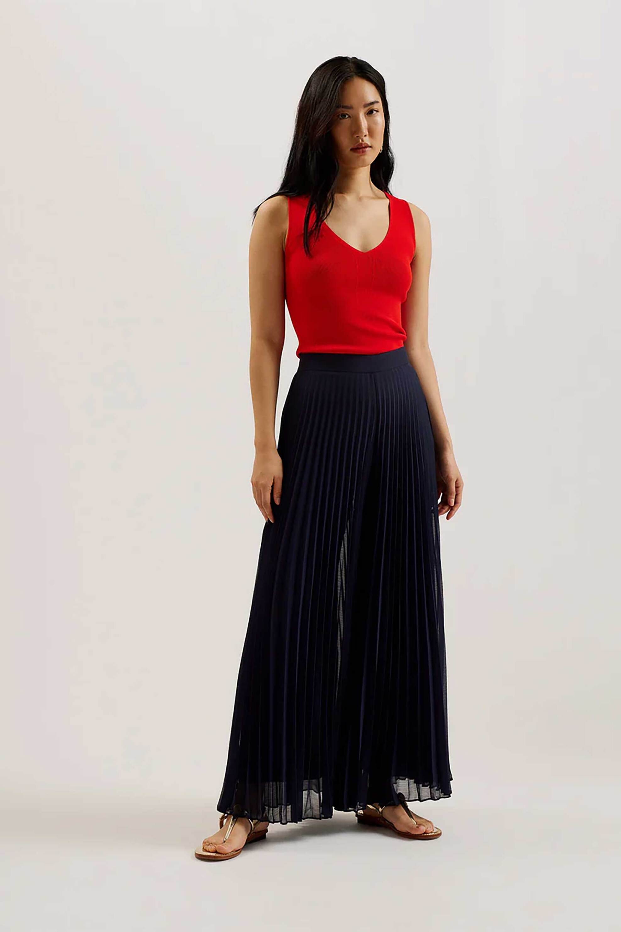 Γυναικείο παντελόνι. Μονόχρωμο. Ελαστική μέση. Κλείσιμο με φερμουάρ στο πλάι. Wide leg. 100% polyester