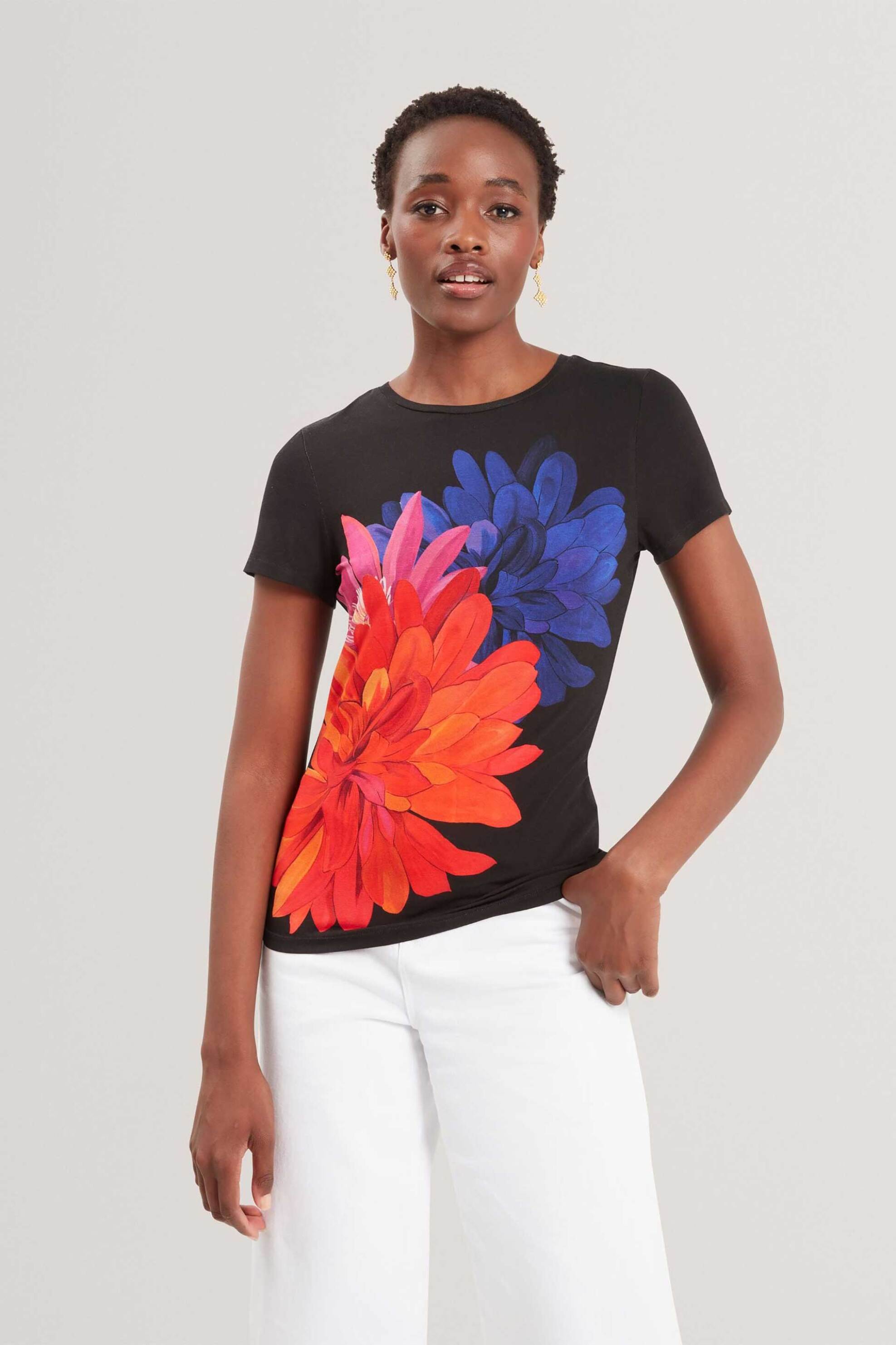 Γυναικείο t-shirt. Στρογγυλή λαιμόκοψη. Floral print. Προέλευση: Τουρκία. 95% βισκόζη, 5% elastane Το μοντέλο έχει ύψος 179 cm και φοράει νούμερο 36. SPORT & FASHION FREEDOM A.E.