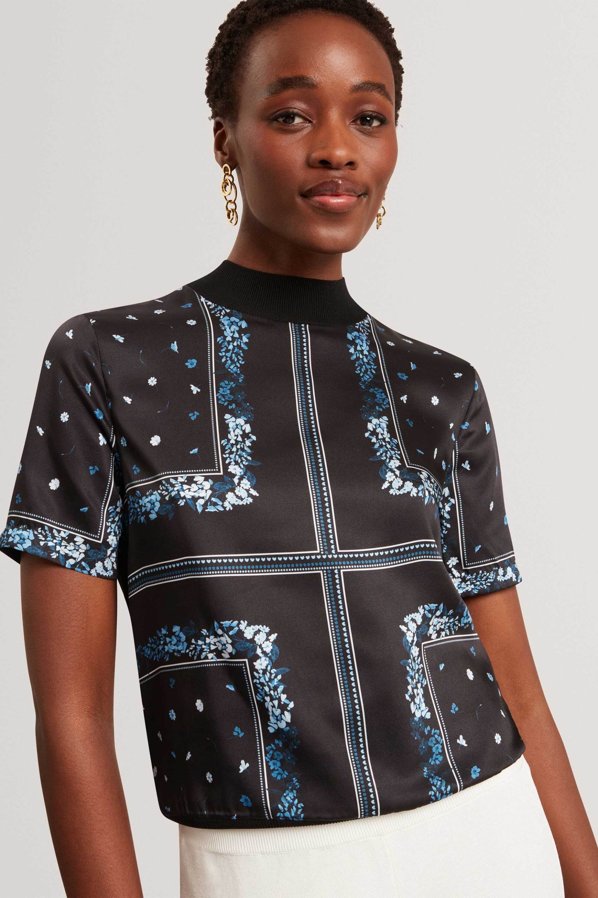 Γυναικείο τοπ. Κλειστή λαιμόκοψη. Κοντό μανίκι. Scarf print. Μονόχρωμο στο πίσω μέρος. Προέλευση: Κίνα. 100% bright rayon SPORT & FASHION FREEDOM A.E.
