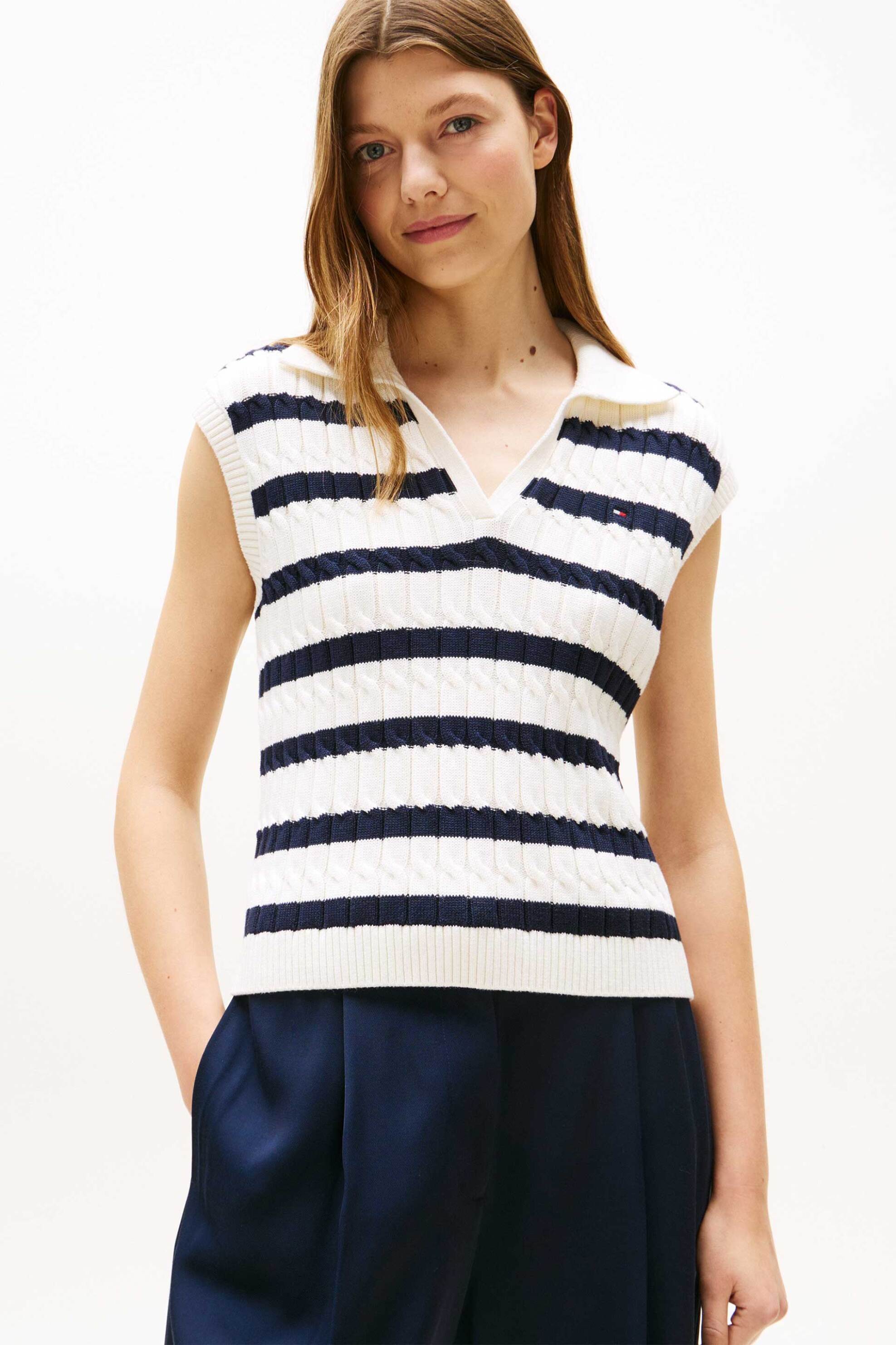 Γυναικεία πλεκτή μπλούζα πόλο. Ριγέ σχέδιο. V λαιμόκοψη. Αμάνικη. Regular fit. Προέλευση: CN. 100% βαμβάκι SARKK ΑΕ