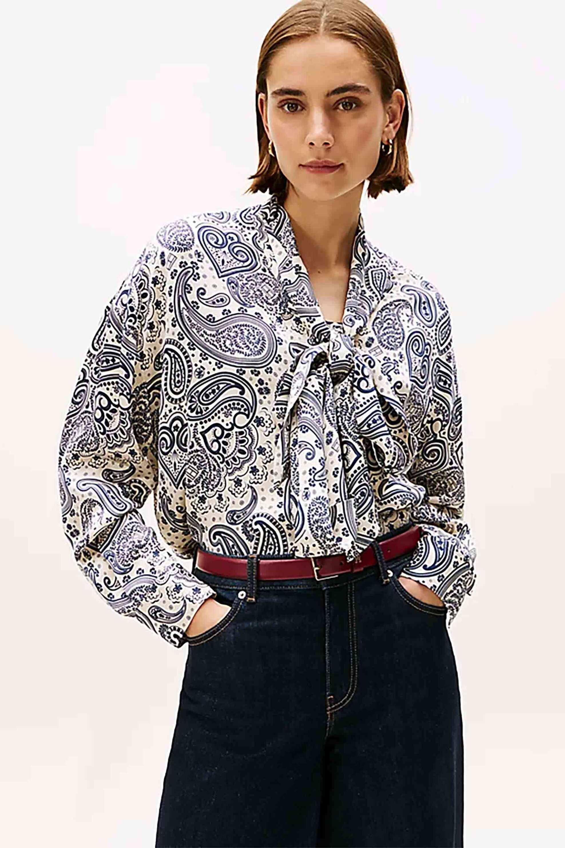 Γυναικεία μπλούζα. Paisley pattern. Δέσιμο στην λαιμόκοψη. Σατέν όψη. Oversized fit. Προέλευση: TR. 100% βισκόζη SARKK ΑΕ