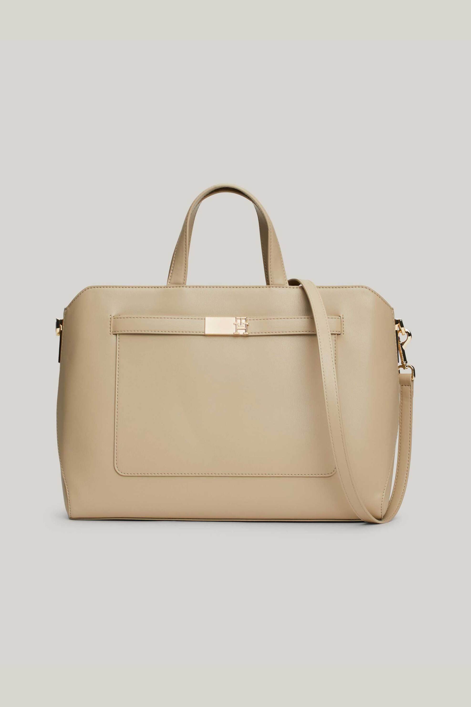 Γυναικεία τσάντα χειρός. Μονόχρωμη. Κλείσιμο με φερμουάρ. Σταθερές λαβές χειρός. Αποσπώμενο ρυθμιζόμενο λουράκι ώμου. Μεταλλικό μονόγραμμα στο μπροστινό μέρος. Θήκη με φερμουάρ στο πίσω μέρος. Εσωτερική τσέπη με φερμουάρ. Διαστάσεις: 36 x 13 x 26 cm. 100% polyurethane