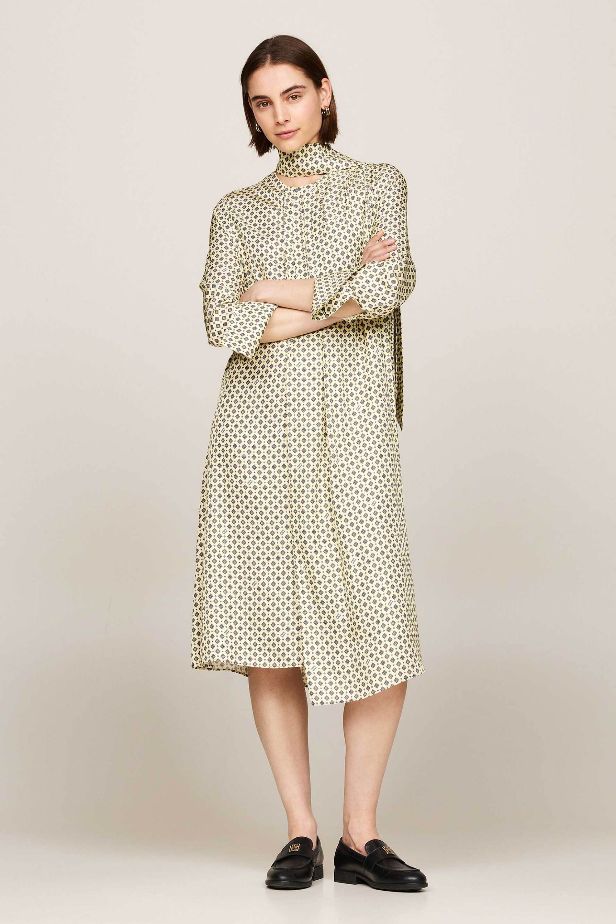 Γυναικείο φόρεμα midi. All-over print. Μακρύ μανίκι. Στρογγυλή λαιμόκοψη. Φουλάρι στο λαιμό. Relaxed fit. 66% sustainable viscose, 34% EcoVero™ viscose Το μοντέλο έχει ύψος 176 cm και φοράει 8.