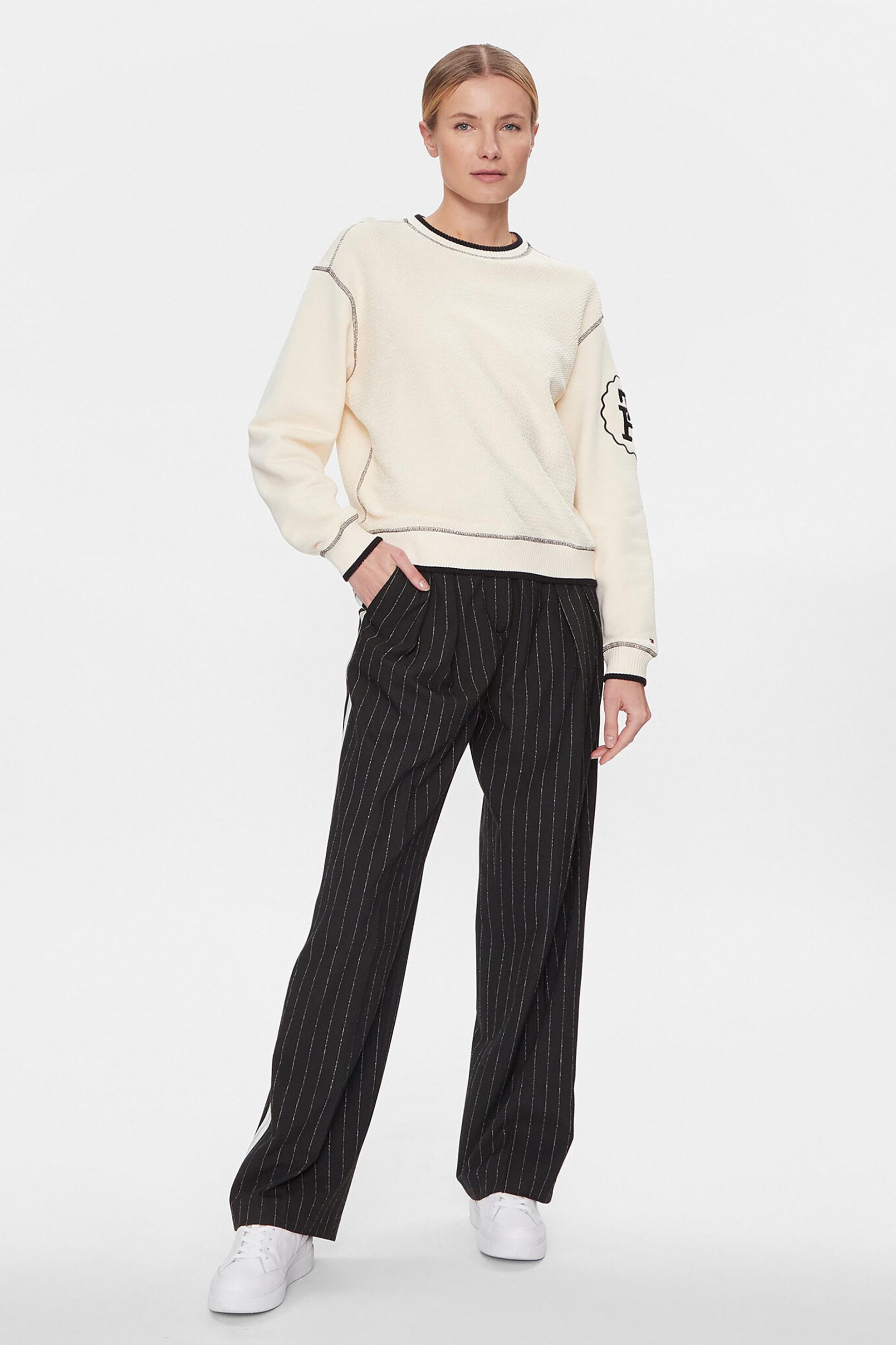 Γυναικείο παντελόνι. Ριγέ σχέδιο. Κλείσιμο με κουμπί και φερμουάρ. Τσέπες στο πλάι και στο πίσω μέρος. Contrast ρίγα με monogram logo στο πλάι. Relaxed straight fit. 34% βισκόζη, 63% recycled polyester, 3% elastane Sustainable: προϊόν που έχει κατασκευαστεί με ίνες ανακυκλωμένου πλαστικού, μειώνοντ...