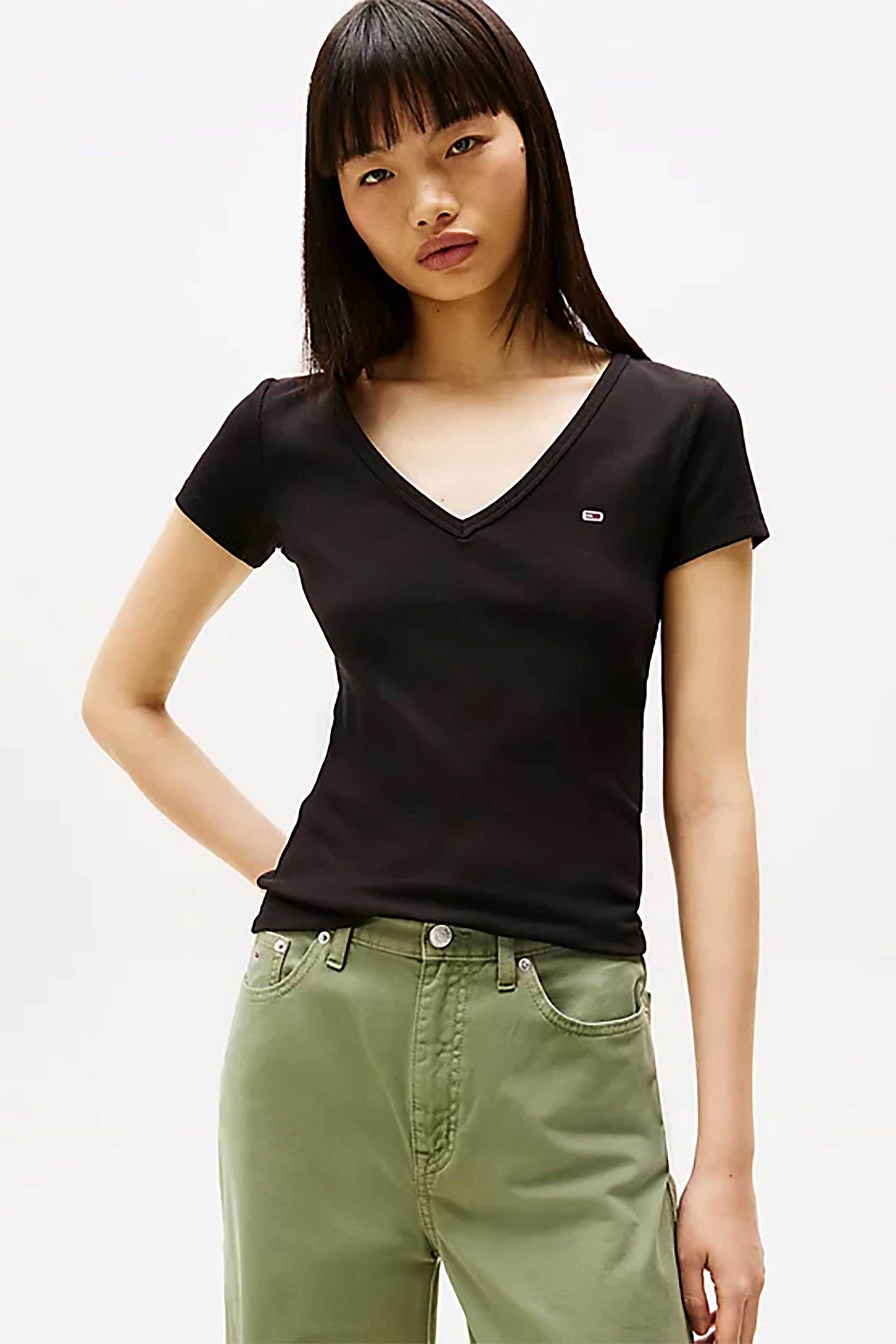 Γυναικείο T-shirt. Μονόχρωμο. Ribbed. V λαιμόκοψη. Κεντημένο λογότυπο στο στήθος. Slim fit. Προέλευση: BD. 95% βαμβάκι, 5% elastane SARKK ΑΕ