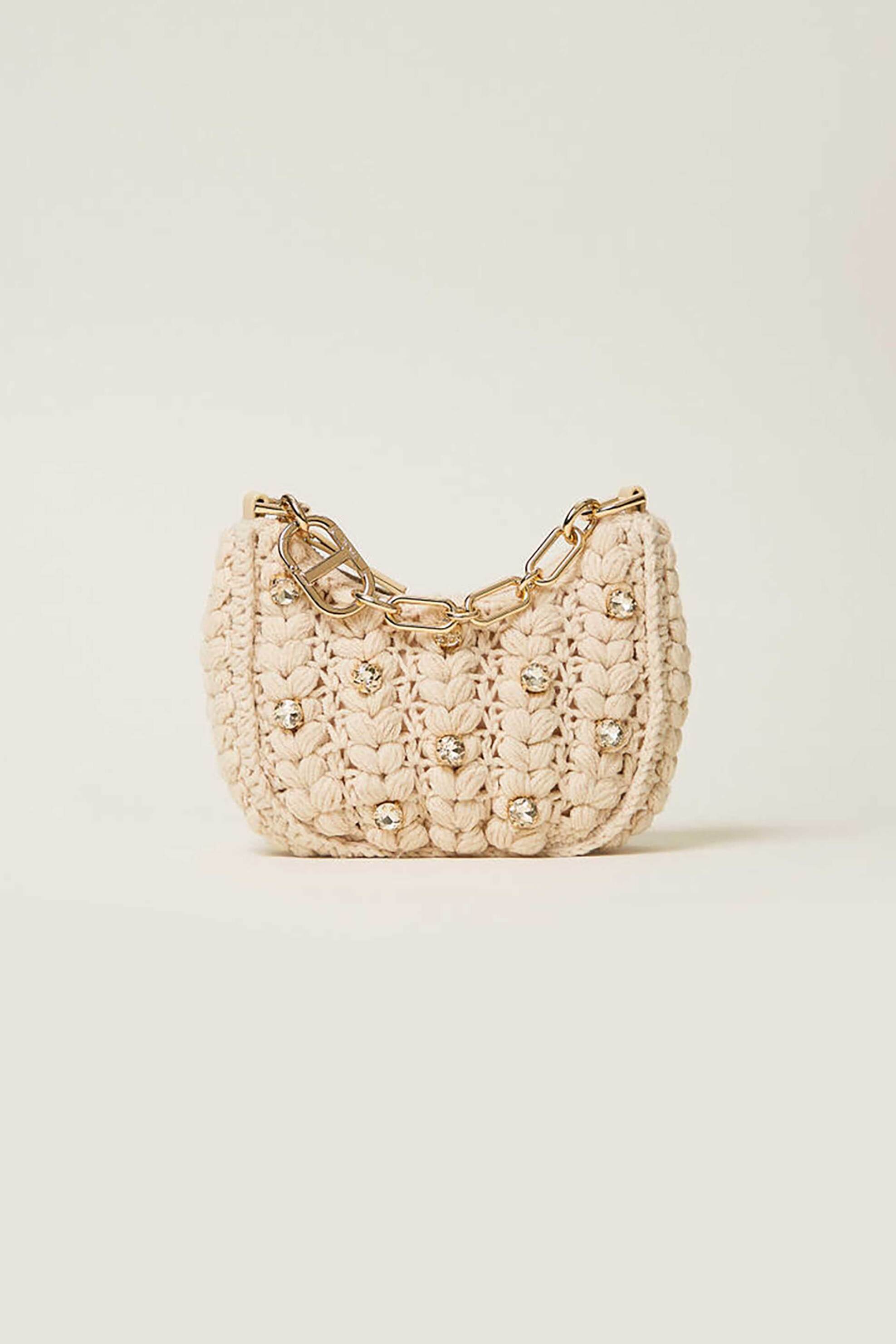 Γυναικεία πλεκτή τσάντα χειρός. Στρας. Κλείσιμο με φερμουάρ. Λουράκι ώμου με αλυσίδα. Διαστάσεις: 18 x 12 x 6 cm. Προέλευση: Italy. 80% acrylic, 20% βαμβάκι ΠΑΓΩΝΗ Ε. ΑΕ ΕΙΣ.ΕΜΠΟΡ.ΒΙΟΜ.ΕΝΔΥΜΑΤΩΝ