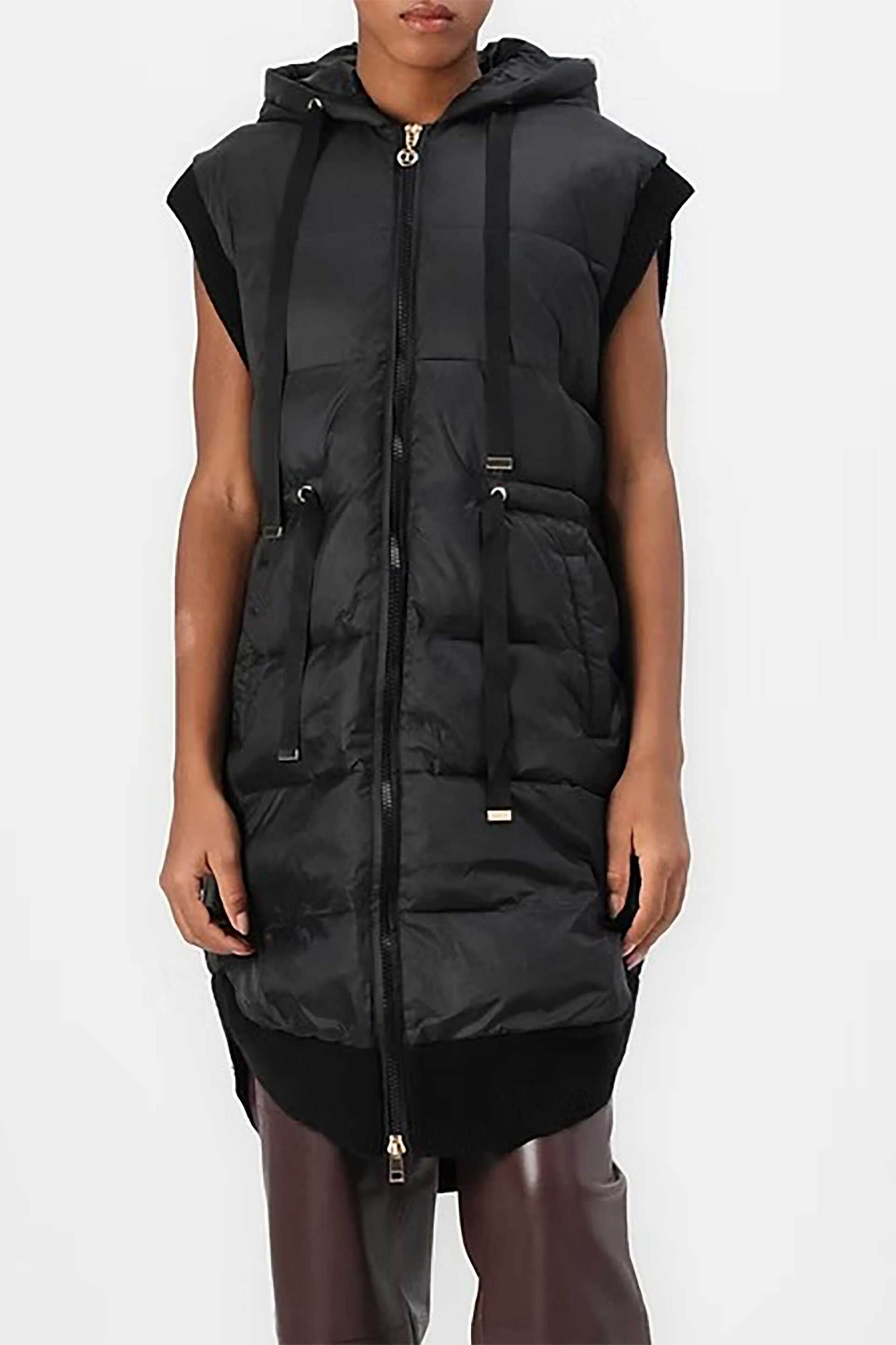Γυναικείο μπουφάν. Μακρύ. Καπιτονέ σχέδιο. Κουκούλα. Αμάνικο. Κλείσιμο με φερμουάρ. Τσέπες στο πλάι. Προέλευση: Italy. 100% nylon ΠΑΓΩΝΗ Ε. ΑΕ ΕΙΣ.ΕΜΠΟΡ.ΒΙΟΜ.ΕΝΔΥΜΑΤΩΝ