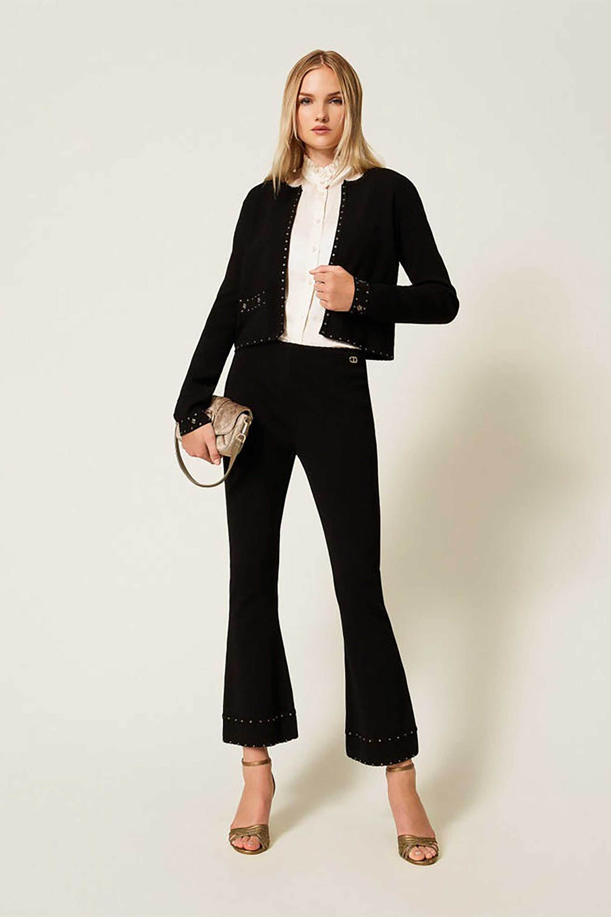 Γυναικείο παντελόνι. Cropped. Μονόχρωμο. Ελαστική μέση. Flared fit. Διακοσμητικά μεταλλικά τρουκς. Προέλευση: Italy. 60% βισκόζη, 26% polyester, 14% polyamide Το μοντέλο έχει ύψος 178 cm και φοράει νούμερο S/40. ΠΑΓΩΝΗ Ε. ΑΕ ΕΙΣ.ΕΜΠΟΡ.ΒΙΟΜ.ΕΝΔΥΜΑΤΩΝ