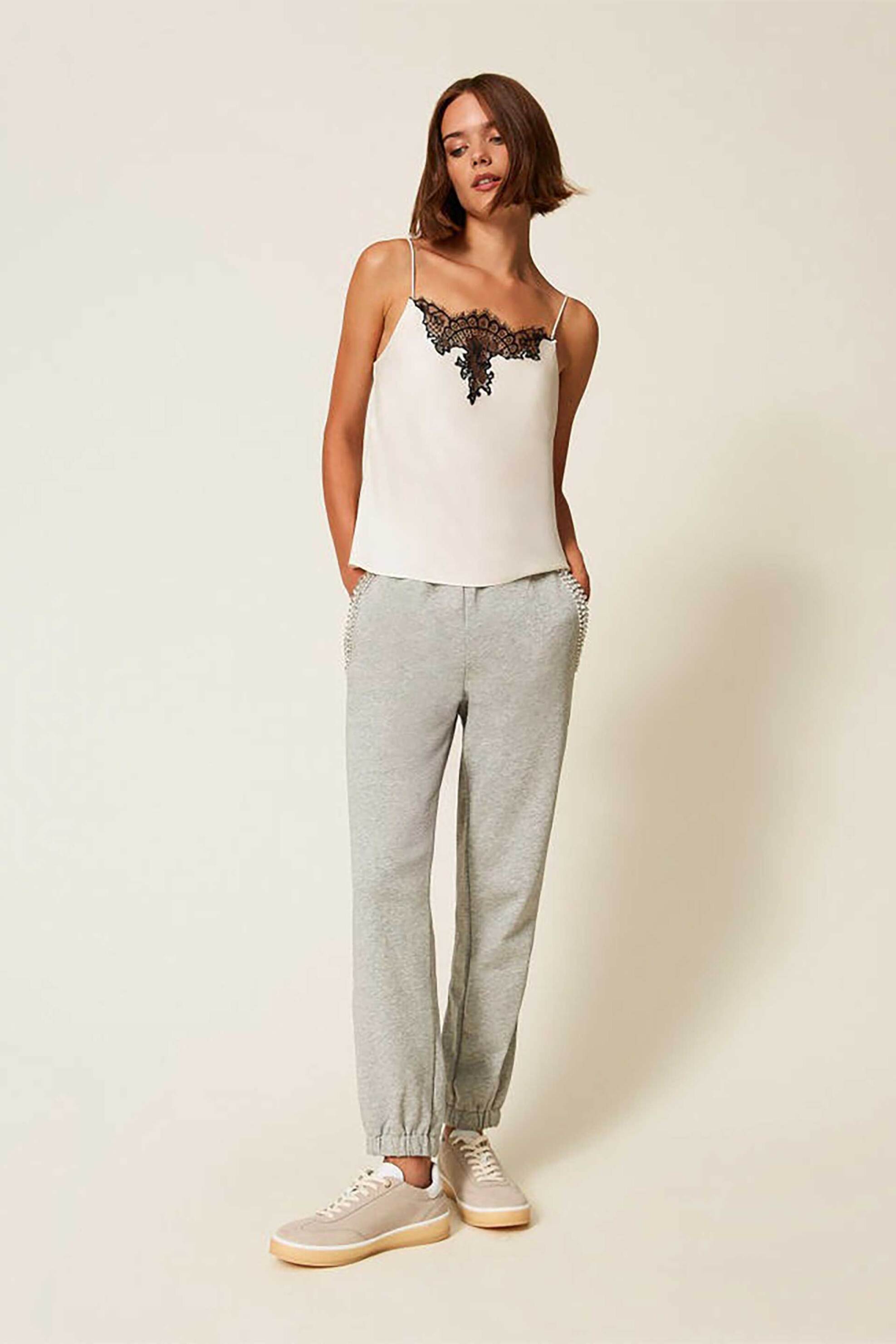 Γυναικείο παντελόνι. Ελαστική μέση. Tσέπες με διακοσμητικές πέτρες και πέρλες. Λάστιχο στο κάτω μέρος. Προέλευση: Italy. 100% βισκόζη Το μοντέλο έχει ύψος 178 cm και φοράει νούμερο S/40. ΠΑΓΩΝΗ Ε. ΑΕ ΕΙΣ.ΕΜΠΟΡ.ΒΙΟΜ.ΕΝΔΥΜΑΤΩΝ