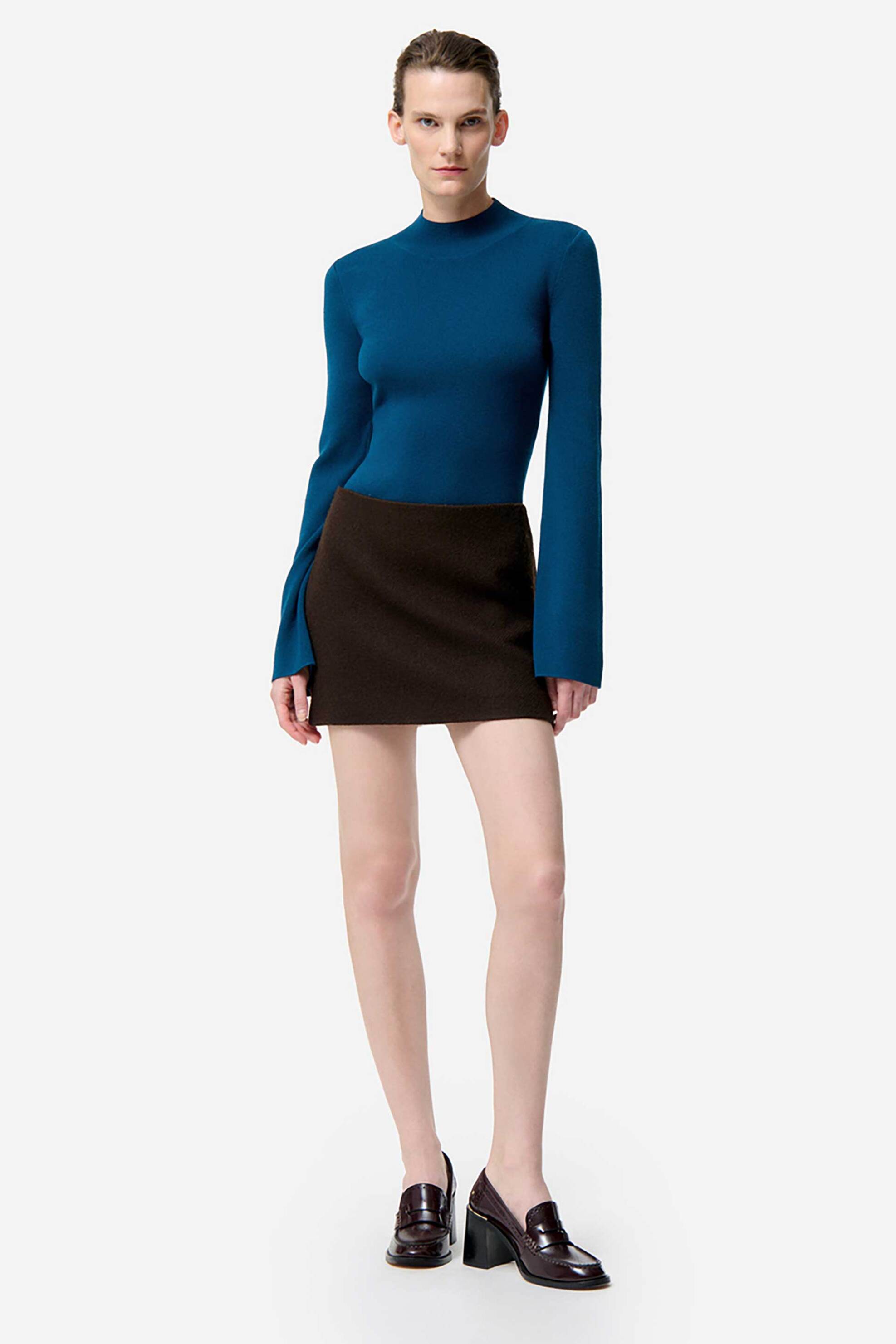 Γυναικεία μπλούζα πλεκτή. Κλειστή λαιμόκοψη. Μακρύ μανίκι flare. Προέλευση: CN. 50% βαμβάκι, 50% μαλλί Το μοντέλο έχει ύψος 177 cm και φοράει νούμερο 1. SOLUNE SAS