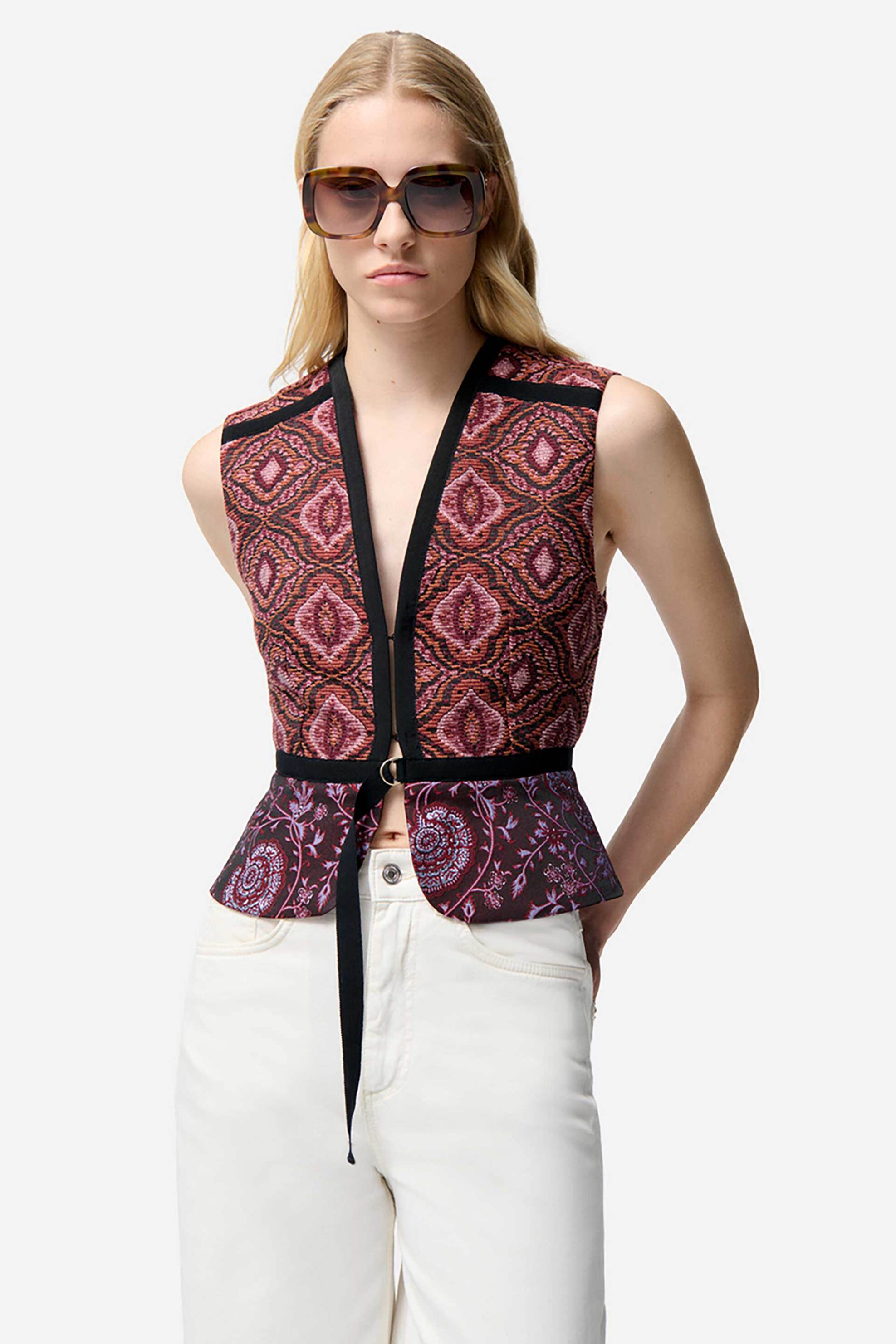 Γυναικείο γιλέκο. Κλείσιμο με κόπιτσες και υφασμάτινο ζωνάκι. Mπροκάρ ύφασμα σε στυλ boho. V λαιμόκοψη. Προέλευση: TN. 66% βαμβάκι, 30% polyester, 4% άλλα υλικά Το μοντέλο έχει ύψος 177 cm και φοράει νούμερο 36. SOLUNE SAS