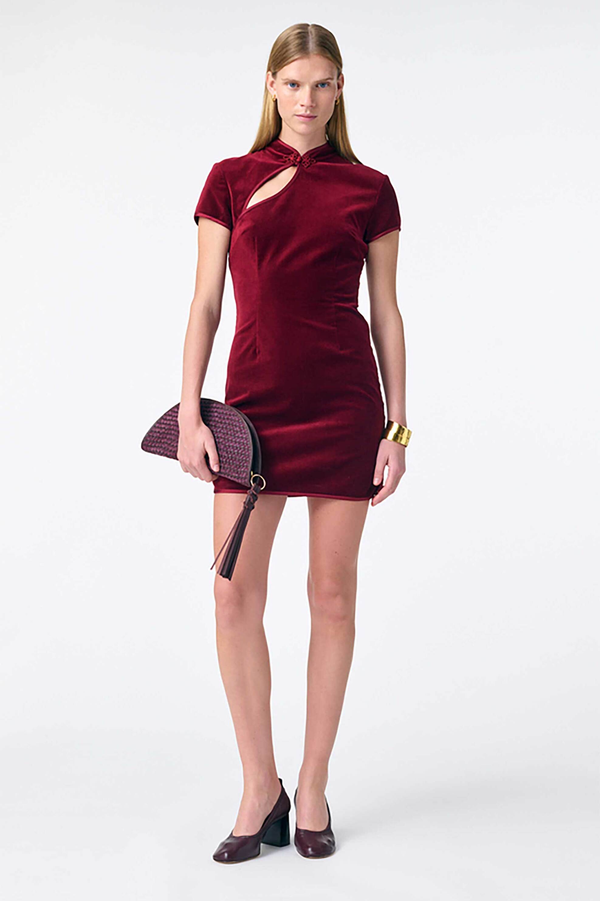 Γυναικείο mini φόρεμα. Velvet. Kλειστή λαιμόκοψη με cut out λεπτομέρεια και κλείσιμο. Κοντό μανίκι. Προέλευση: CN. 98% βαμβάκι,2% elastane SOLUNE SAS