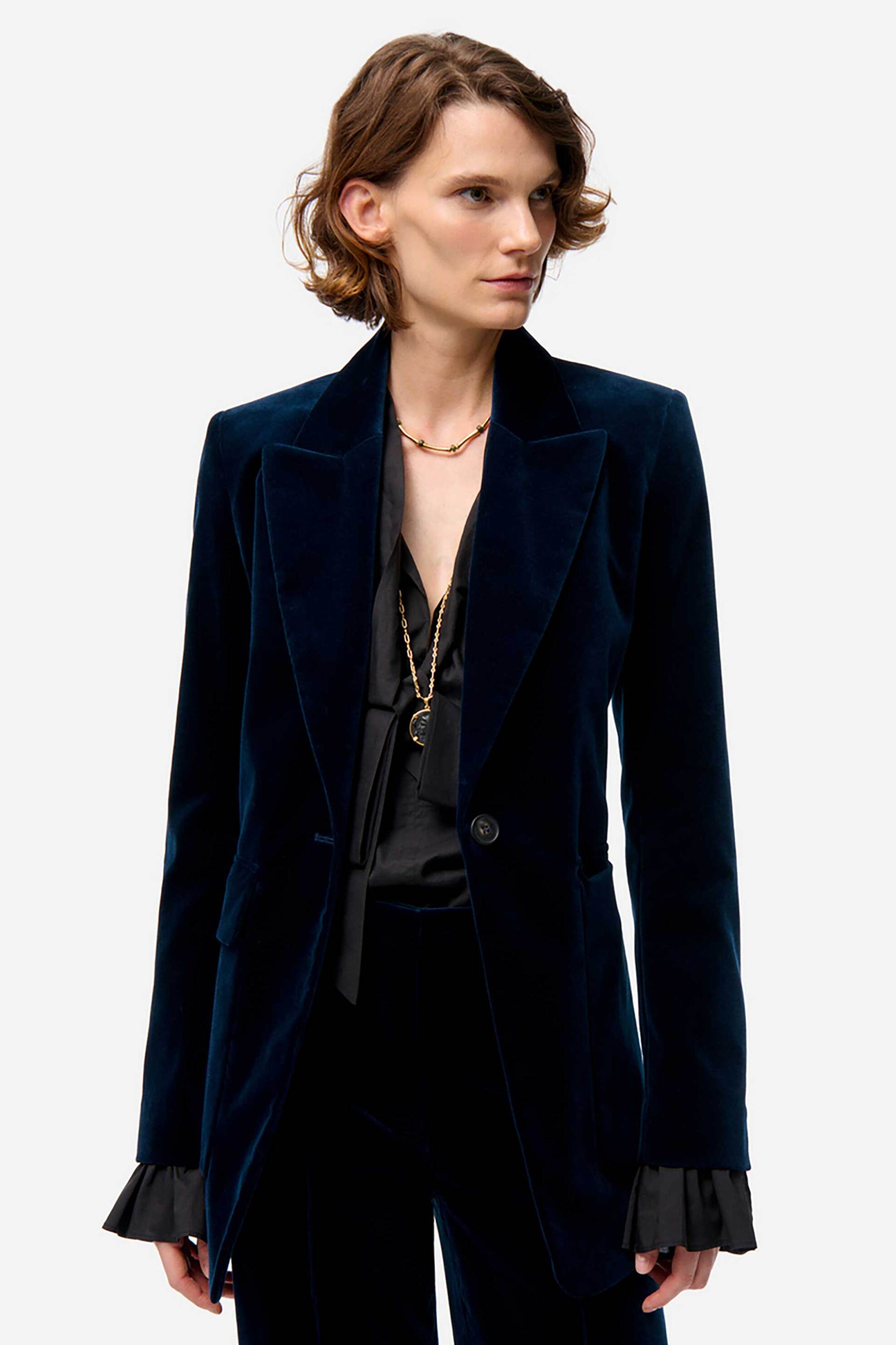 Γυναικείο σακάκι velvet. Γιακάς κλασσικός. Κλείσιμο με κουμπί. Τσέπες flap. Mακρύ μανίκι. Προέλευση: UA. 98% βαμβάκι,2% elastane Το μοντέλο έχει ύψος 177 cm και φοράει νούμερο 36. SOLUNE SAS